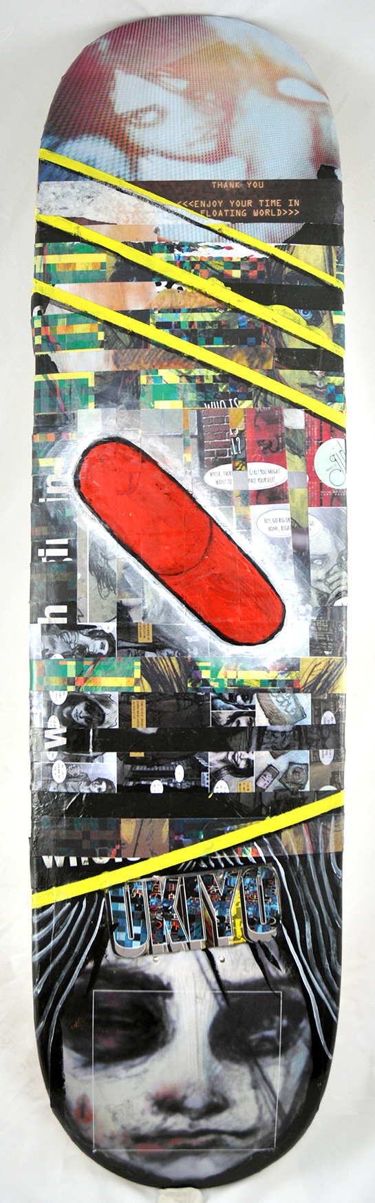 Decoupage paper on skate deck. From our Deck The Walls Skateboard show. Art Purchased from this show will ship after the 16th of December. Please contact us at the Gallery if you have any questions. 561-832-4655. By: Cary Polkovitz Medium: Mixed Media Dimensions: 8 x 31.5 ♥ Share This:
