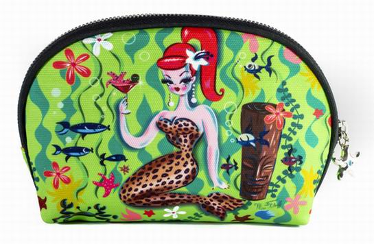 A beautiful and glamorous pinup inspired leopard print mermaid holds a starfish martini. Have yourself a tiki tropical tiki cocktail and do your makeup! The canvas fabric makes the makeup bag look like a beautiful watercolor painting. Original artwork by Miss Fluff (Claudette Barjoud). The interior is a whimsical tropical floral custom print Fluff lining.And to top things off, the cosmetic bag is complete with an adorable silver Fluff starfish charm that sparkles with an aqua blue crystal! Perfect for gals who love pinup, rockabilly, tiki, or just cute, vintage inspired things! By: Miss Fluff Medium: Cosmetic Bag Dimensions: 7 x 6 x 2 ♥ Share This: |