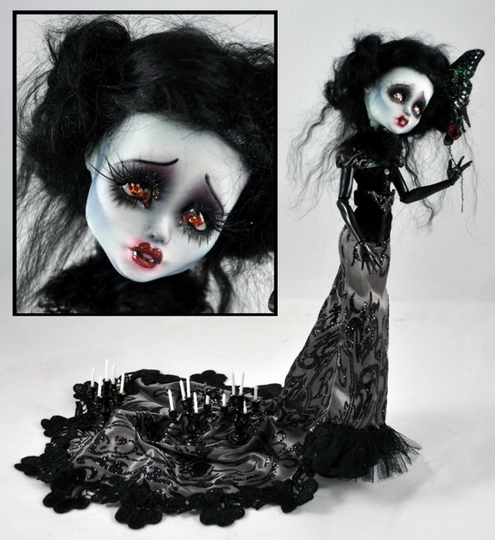 Custom hand painted doll inspired by original artwork by Dustin Bailard. Handmade dress, accessories and hair piece. Pieces purchased from this show will ship after the show closes on Nov 19th. Please contact us at the Gallery if you have any questions. 561-832-4655. By: Jennifer D. Basing Medium: Sculpture Dimensions: 16 x 6 ♥ Share This: