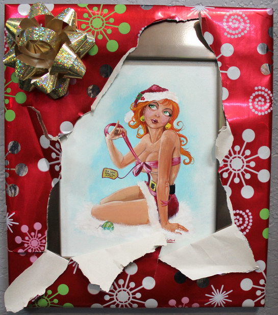 Fuck that if she's sitting on my fuzzy rug wearing just a bow you can damn well be sure that the last thing I will be thinking about will be what day Jesus imaginary birthday! Original Acrylic on Board. Framed with Christmas wrapped frame and a bow. By: JR Linton Medium: Acrylic Original Dimensions: 9 x 12 ♥ Share This:
