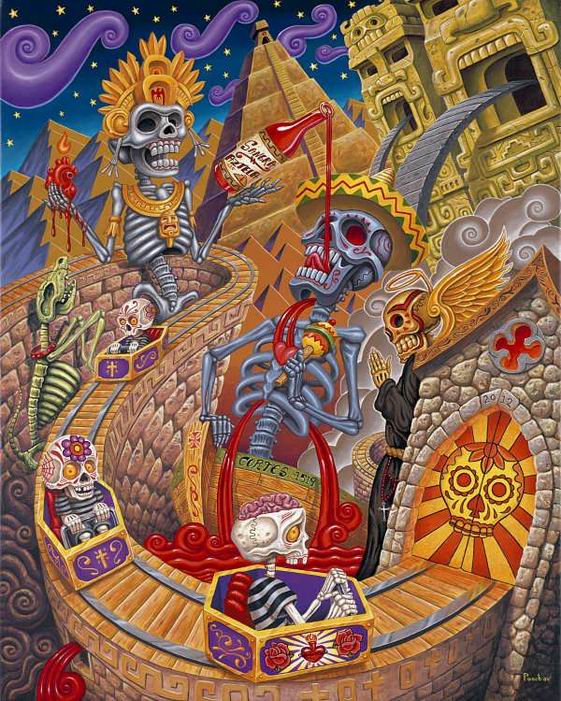 Aztec blood, Sacred heart, hearts and blood sacrificed. Giclee on Watercolor Sailing across seas of blood, from Spain, Cortes conquers the Aztecs in 1519, bringing them the word of God ( gold, just add the L or El !) The Aztec tradition of the Little Feast of the Dead, honoring dead children and the Great Feast of the Dead, honoring dead adults, in the ninth and tenth month, respectively, was incorporated into the Christian All Souls and All Saints Day, which is now known as "Dia de los Muertos" or Day of the Dead. Franciscan friars were charged with the spiritual conversion of the Aztecs. They burned pagan icons destroyed shrines and imprisoned Aztec priests. In this painting we see the dead children in the afterlife riding in coffin cars through a surreal and symbolic version of history, as they approach Mexico's ultimate spiritual destiny in the form of the catholic church, with it's stained glass doors depicting the Day of the Dead sugar skull inviting them in, but within the dogma will burn all pagan thought from their minds. Ironically we see a strange similarity between the disembodied heart of Aztec sacrifice and the Catholic Sacred heart dripping with blood "it's a small world after all" By: Pooch (Michael Pucciarelli) Medium: Giclee Dimensions: 18 x 24 ♥ Share This: