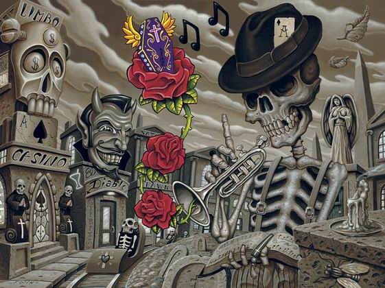 Giclee on Watercolor Driving back from Atlanta after a tattoo convention I had time to conjure up the ideas for this image, my initial idea was to juxtapose a skeleton with red roses, as a sort of funeral symbolism, then I struck upon the idea to have the roses manifesting out of a trumpet which the skeleton would be playing. This led me into the New Orleans jazz concept and having him in a cemetery with tombs, well I redrew the tombs and turned them into casinos and bars reflecting the bourbon street sort of vibe, so in essence you have this skeleton, which is the minister presiding over a funeral in the afterlife where the tombs are transformed into urban counterparts. The newcomers, dressed in day of the dead costumes, are transported to the great beyond by ghost train cars, all around them are temptations in the form of casinos and bars. If they would only follow the music they could climb the rosevine to paradise. To play good jazz you got to have soul! By: Pooch (Michael Pucciarelli) Medium: Giclee Dimensions: 18 x 24 ♥ Share This: