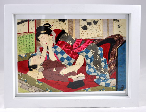 Rare Ukiyo-e Shunga Print Meji Era (1868-1912). Excellent color, may have slight staining. size: 18.3cm ×12.7cm (5x7.5 approx) Translated literally, the Japanese word shunga means picture of spring; spring is a common euphemism for sex. The ukiyo-e movement as a whole sought to express an idealisation of contemporary urban life and appeal to the new ch?nin class. Following the aesthetics of everyday life, Edo period shunga varied widely in its depictions of sexuality. As a subset of ukiyo-e it was enjoyed by all social groups in the Edo period, despite being out of favour with the shogunate. Almost all ukiyo-e artists made shunga at some point in their careers, and it did not detract from their prestige as artists By: Unknown Medium: Woodblock Print Dimensions: 5 x 7 ♥ Share This: |