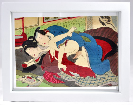Rare Ukiyo-e Shunga Print Meji Era (1868-1912). Excellent color, may have slight staining. size: 18.3cm Χ12.7cm (5x7.5 approx) Translated literally, the Japanese word shunga means picture of spring; spring is a common euphemism for sex. The ukiyo-e movement as a whole sought to express an idealisation of contemporary urban life and appeal to the new ch?nin class. Following the aesthetics of everyday life, Edo period shunga varied widely in its depictions of sexuality. As a subset of ukiyo-e it was enjoyed by all social groups in the Edo period, despite being out of favour with the shogunate. Almost all ukiyo-e artists made shunga at some point in their careers, and it did not detract from their prestige as artists By: Unknown Medium: Woodblock Print Dimensions: 5 x 7 ♥ Share This:
