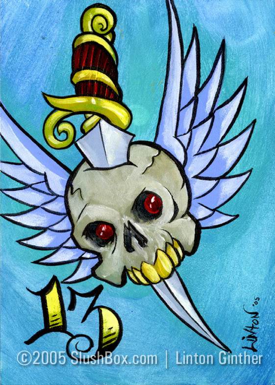 Skulls are cool, so are knives what else is there to say? 5 x7 Original Acrylic on board. By: JR Linton Medium: Acrylic Original Dimensions: 5 x 7 ♥ Share This: |