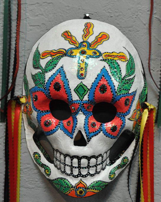 Hand painted sugar skull mask white w/ multi colors Art Purchased From this show is on display till November 28th. Any Purchases made will be shipped after show closing. By: Joni Berte Medium: Mixed Media Dimensions: 9 x 6 ♥ Share This: