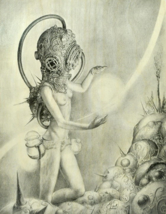Print on Wood Woman with Diving Helmet. Art Purchased From this Show is on Display till October 11th and will be shipped after that if purchased.