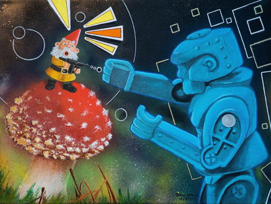 Fairytales and Robots. Art Purchased from this show will ship after the show closes on Feb 28th. Please contact us at the Gallery if you have any questions. 561-832-4655. By: Darren F Gideon Medium: Mixed Media Dimensions: 24 x 18 ♥ Share This: