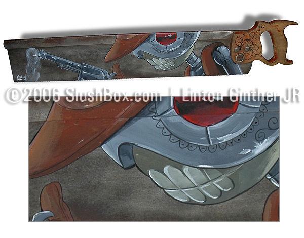 Mecha-The-Kid takes out another human in his quest to extinguish mankind. Original Acrylic on saw balde (ouch its sharp) 26" blade. 31.5" x 5" total. Only one of these! By: JR Linton Medium: Acrylic Original Saw Blade Dimensions: 31.5 x 5 ♥ Share This:
