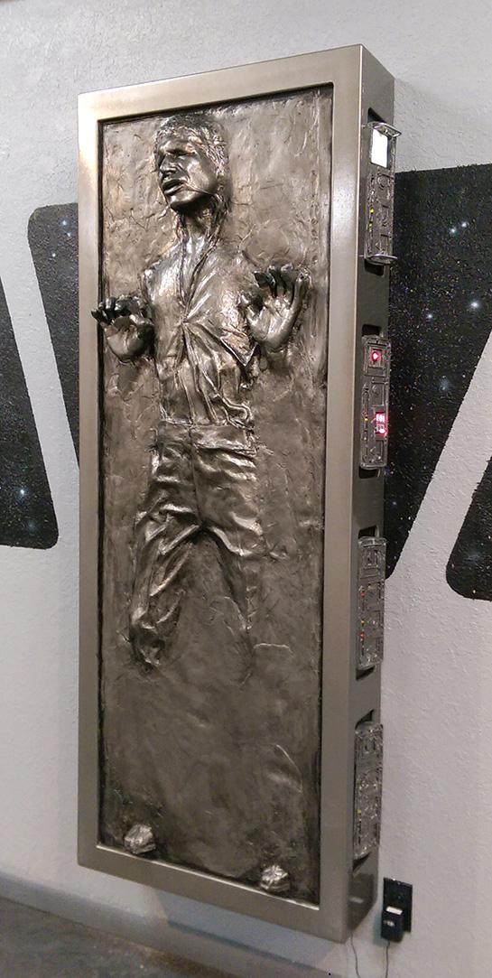 Art from our Nerdcore III - The Geek Strikes Back Group Art Show. Art Purchased from this show will ship after the show closes on June 20th. Please contact us at the Gallery if you have any questions. 561-832-4655. This is a full statue of Han in Carbonite, Built of a mold of the original has workign LED lights running off ac power or 9volt battery. Easy to hang. it only weighs about 80lbs but may be cost prohibative to ship plan on between 300-400 shipping costs, cost will be estimated on check out and difference in cost will be invoiced or refunded once its boxed up. By: Lintons Inc Medium: Mixed Media Dimensions: 32x75 ♥ Share This: |
