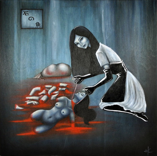 Mixed media oil, acrylic and ink on wood panel. Rendition of a scene from the Japanese Horror film "Audition" From our "KILL ROOM" group Art Show featuring artwork that pays tribute to our favorite horror movie, book, TV show etc. ***** Art Puchased will be shipped after show closes on November 28th By: Kristy Elena Medium: Mixed Media Dimensions: 16 x 16 ♥ Share This: