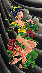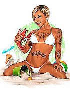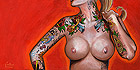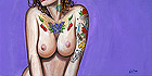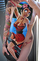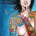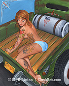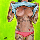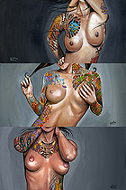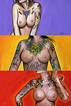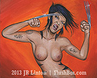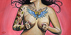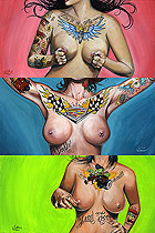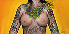 Ok first I wanted to let everyone know I will be starting to take bookings for the South Florida Tattoo Expo Aug 13th - 15th. Contact me at jr@hellcattattoo.com If you want to get tattooed at the show! I'm especially looking for some crazy shit to do for tattoo of the day for each of the days. Also a call to all my previously tattooed folks. If you have any pieces you want to enter in the competition I'd be much appreciated. Contest is on Saturday, be there early to register. On to other business. Ok my slacking ass finally got around to adding new products to the SlushBox.com store. I have all the prints of all 9 editions of the Tits and Tats series including the 3 up posters (three prints in one 12 x18 poster) They are also available individually. Also listed are the prints of Breezy, Pink Love, Look at the Bird, Meant to be and Can't Stop the Rock! And finally some new original paintings are finally available including the 3 Tits and Tats Sets, Pink Love, Can't Stop the Rock, Look at the Bird, my new fav Breezy, and the cool and cheap 6x6 Flasher. Check them out below!